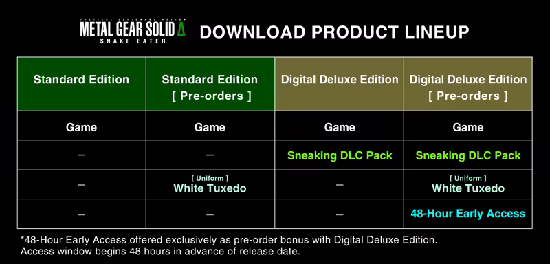 Римейк выпущенной в 2004 году игры METAL GEAR SOLID 3: SNAKE EATER. Та же захватывающая история и увлекательный мир, но с абсолютно новой графикой и трёхмерным звуком, которые ещё лучше передают атмосферу джунглей. Вас ждёт невероятное сочетание выживания, экшена и стелса.